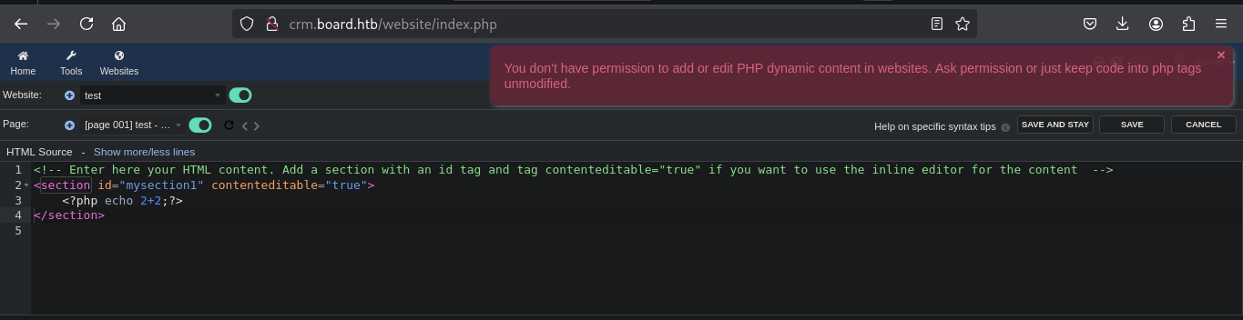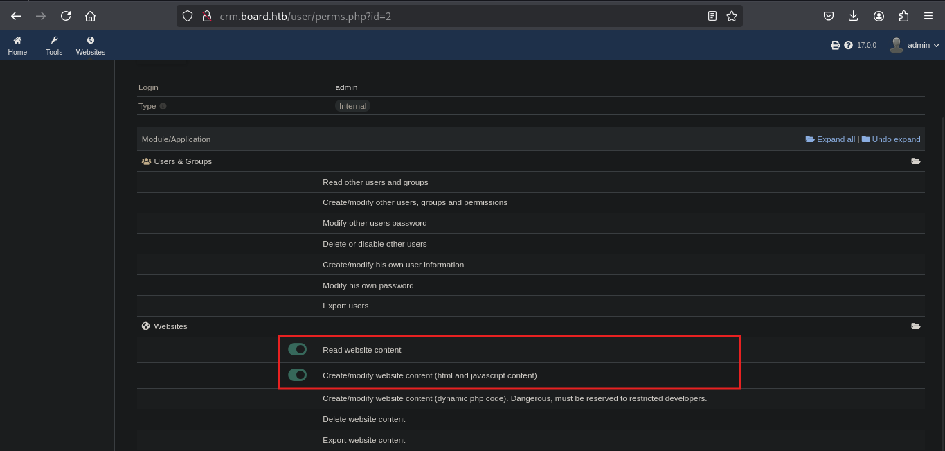 The vulnerability allows authenticated attacker can obtain remote command execution via php code injection bypassing the application restrictions. First we need to confirm that we have the permissions needed