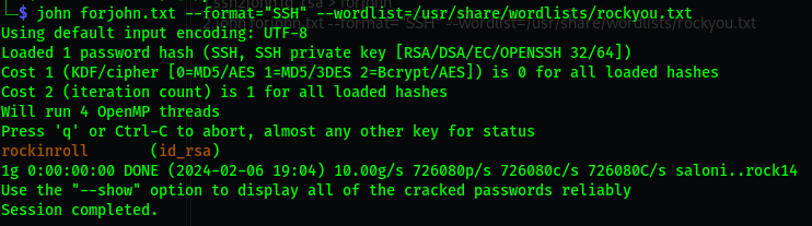 john forjohn.txt --format="SSH" --wordlist=/usr/share/wordlists/rockyou.txt