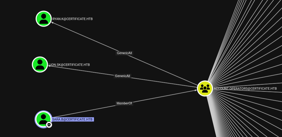 From the graph we get that sara.B is a member of Account Operators and with that we have GenericAll permissions over the user Lion.SK and Ryan.K thus we have full control and we can change their passwords to that of our liking :)
