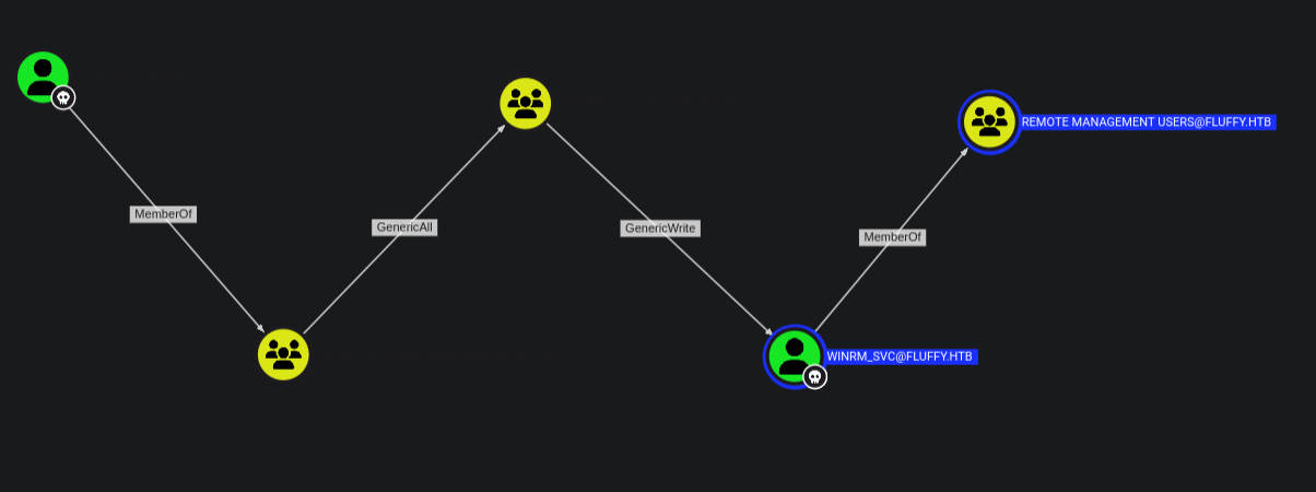 The members of the group SERVICE ACCOUNTS@FLUFFY.HTB have generic write access to the user WINRM_SVC@FLUFFY.HTB. Bloodhound abuse suggests Shadow Credentials attack