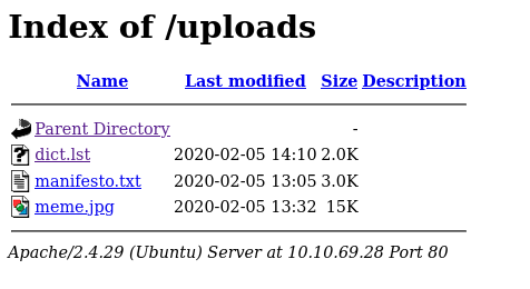 gobuster dir -u http://10.10.69.28 -w /usr/share/wordlists/dirbuster/directory-list-2.3-medium.txt