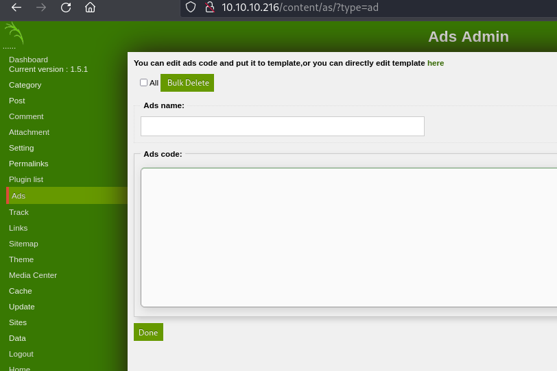 Now go to 10.10.10.216/content/inc/ads/shell.php but first run nc on your machine
