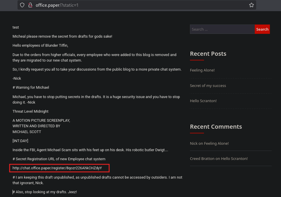 The post exposes a Secret Registration URL of new Employee chat system http://chat.office.paper/register/8qozr226AhkCHZdyY