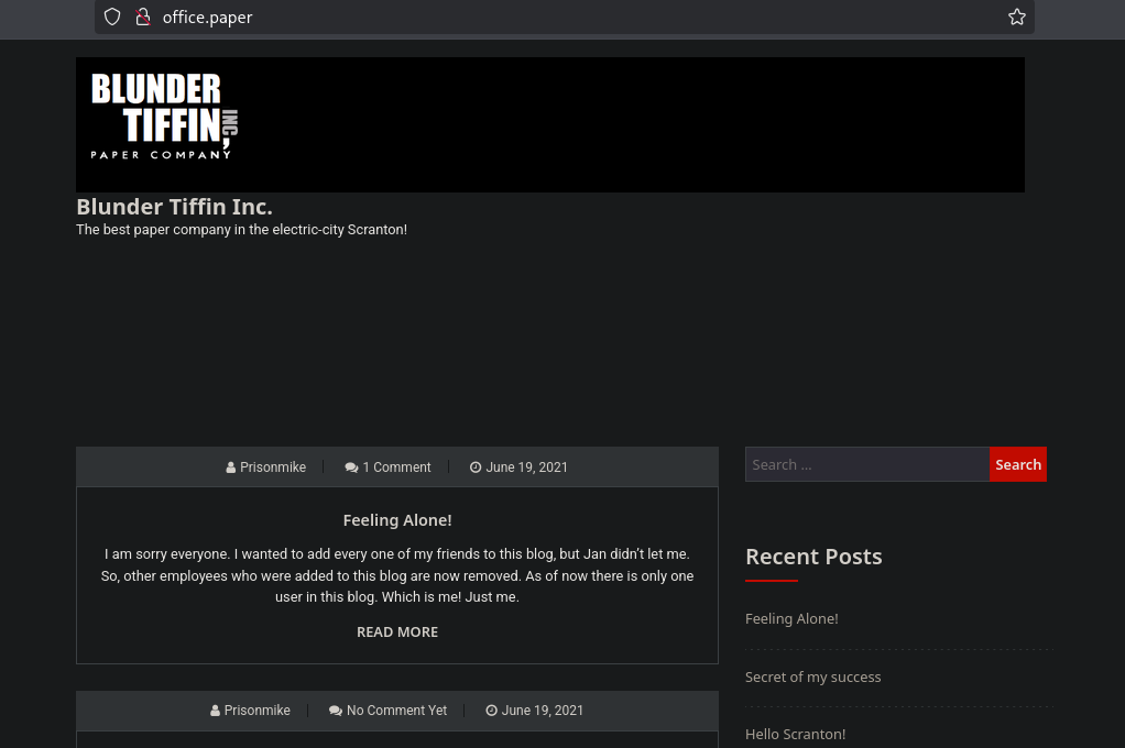 The HTTPS site responded with an additional domain hint: office.paper. Visiting office.paper (added to /etc/hosts mapped to 10.129.88.37) showed a WordPress instance.